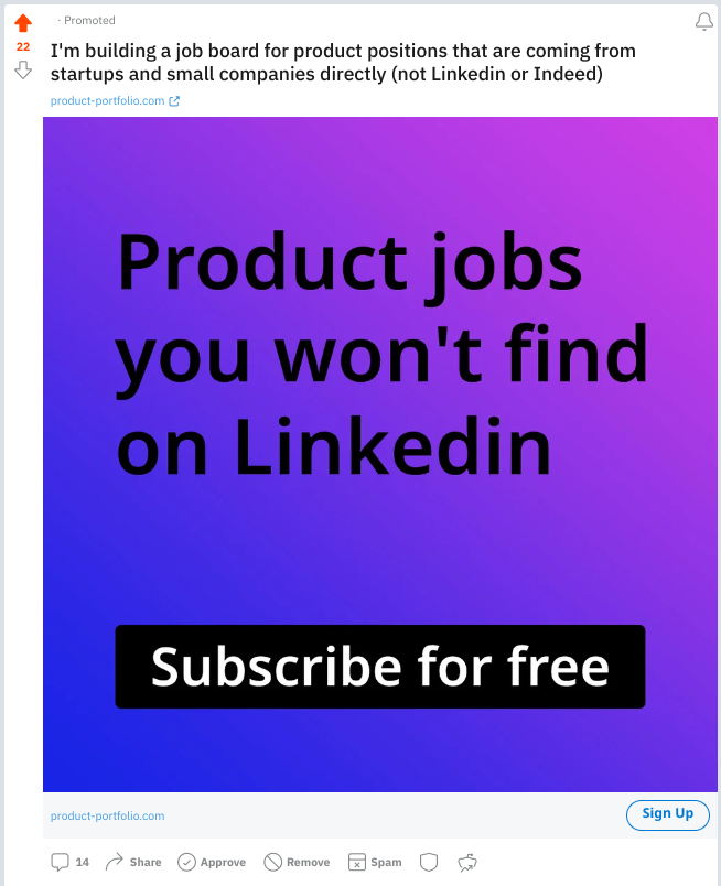 The ad creative focused on the value proposition: “Get access to relevant product jobs you won’t find on LinkedIn.”